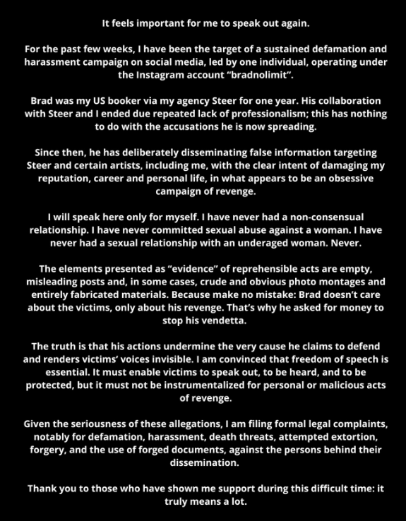 Furthermore, the techno producer emphasized that protecting his integrity remains a priority. As a result, he announced plans to pursue legal action against individuals he believes are responsible for distributing the claims.